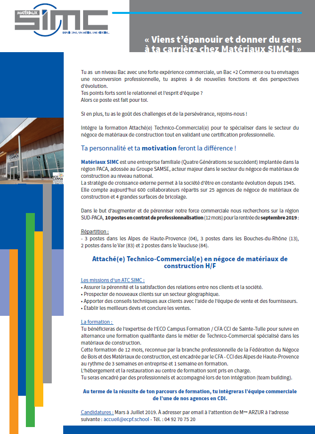 Cette formation de 12 mois, reconnue par la branche professionnelle de la Fédération du Négoce de Bois & des Matériaux de Construction, est encadrée par le CFA-CCI des Alpes de Haute-Provence au rythme de 3 semaines en entreprise et 1 semaine en formation.